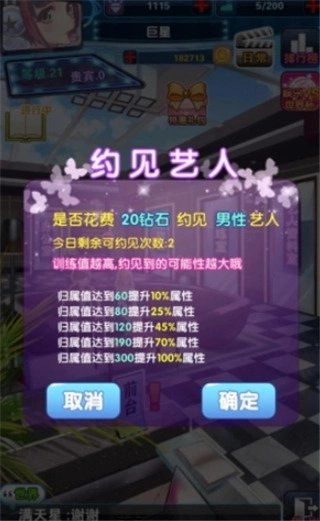 提升归属值同样是增加艺人属性的有效途径,只是获取归属值需耗费钻石来约见艺人。当归属值突破60,艺人属性便会开始获得加成,最高能够提升100%的属性。