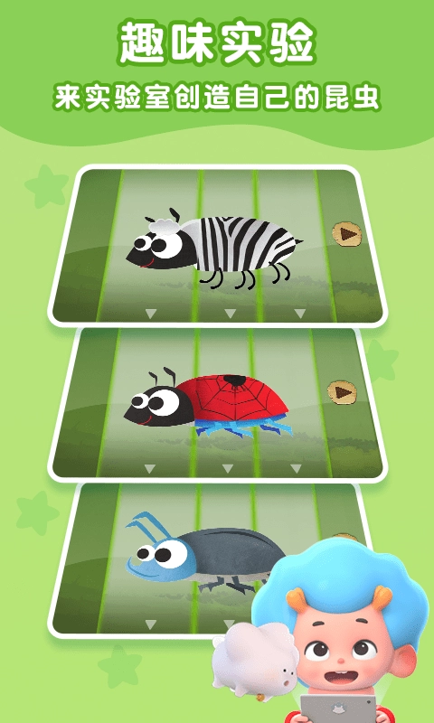 主题式昆虫探索:游戏围绕蜜蜂、蝴蝶、蚂蚁、甲虫及其他昆虫这五大主题展开探索,涵盖三百多种常见与稀有昆虫。每个小章节都会以一只昆虫作为动画主角,孩子需要协助主角解决各类难题,例如帮助蜜蜂储存蜂蜜、协助蝴蝶完成孵化等,完成任务后即可通关,在此过程中能够全面了解不同昆虫的特性。
