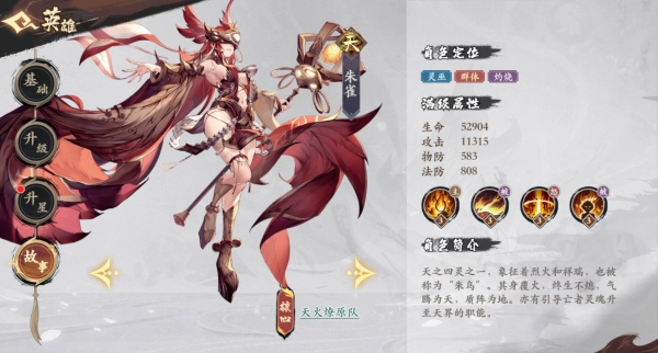 角色背景:作为天之四灵成员,它是烈火与祥瑞的象征,别称“朱鸟”。周身火焰常燃不灭,气息升腾可化作天际,本体铺展能成为大地。此外,它还肩负着引导逝者灵魂去往天界的职责。