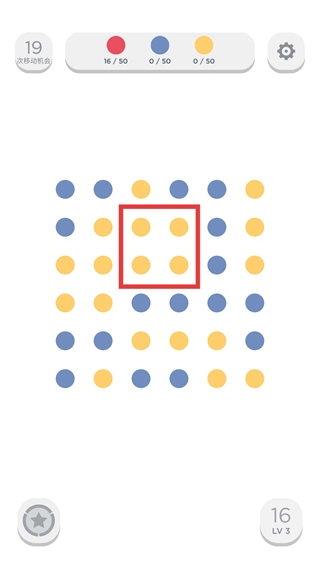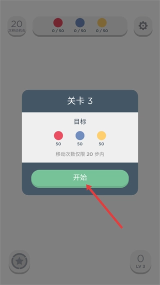 在【关卡-3】界面,先确认需要消除的目标是【50个红色圆点】【50个蓝色圆点】【50个黄色圆点】,然后点击【开始】按钮进入该关卡。