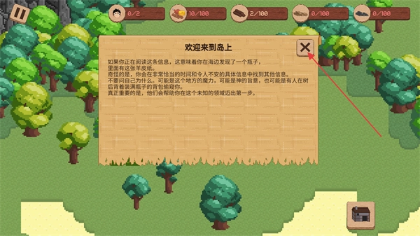 进入游戏后会弹出“欢迎来到岛上”的信息界面,点击界面右上角的关闭按钮,即可关闭此界面并进入游戏的主操作场景。