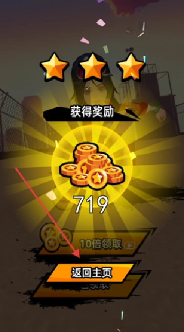 完成关卡后会得到金币奖励,点击返回主页就能继续挑战新关卡,也可以查看其他游戏功能内容。