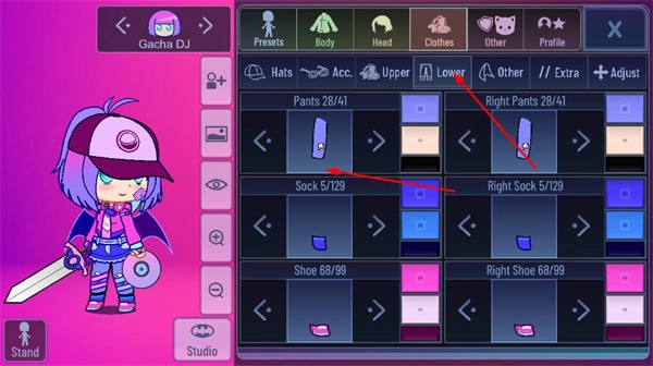 切换至Lower这类分类,挑选裤子、袜子之类的服饰,完成整套穿搭的更换。