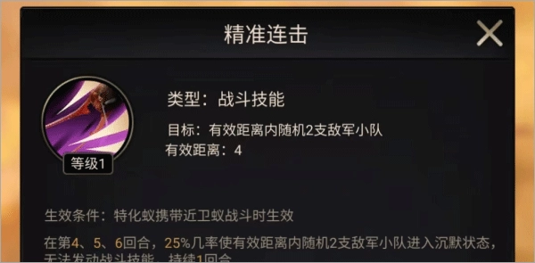 技能目标是有效距离内随机两支敌军小队,该效果同样需在携带近卫蚁战斗时方可生效;初始状态下,在第4、5、6回合,有25%的几率让敌军小队陷入沉默状态,使其无法发动战斗技能,持续时间为1回合;当技能满级后,触发几率将提升至70%。