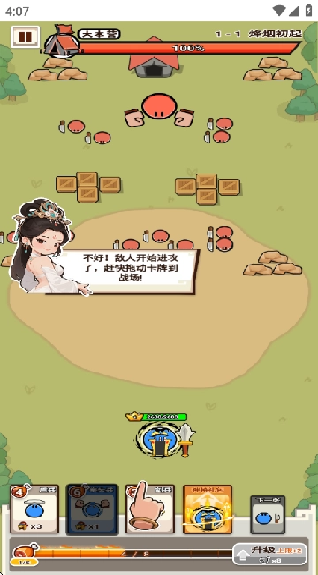 完成实名认证后,你就可以开启第一关的挑战啦,记得把下方的小兵卡牌拖到战场里哦。