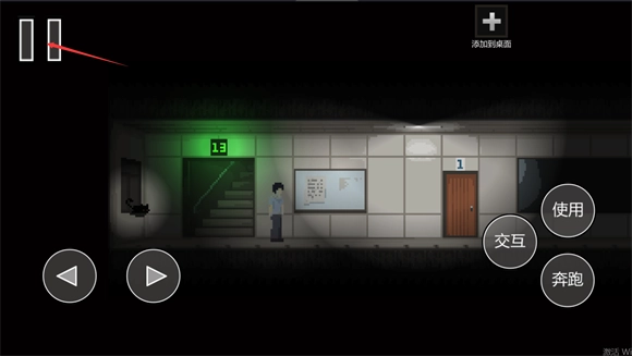 通过左右按钮控制行动方向,行动过程中按住奔跑按钮可实现奔跑;按下交互按钮则能与场景中的元素进行互动。