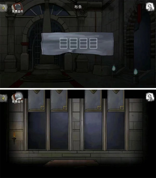 在右侧墙上开展游戏,把物体和轮廓对齐重合(要记得点击右侧的按钮来旋转物体);当看到金属拉环后,用麻绳将拉环与柱子连接起来,转动拉环就能打开牢房门。