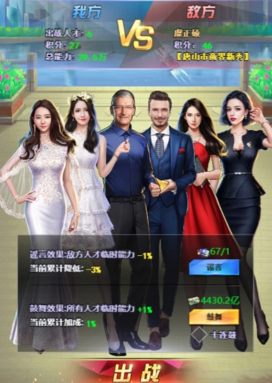 选好出战阵容后,系统会依据当前排名来匹配对手。战斗开始前,你可以花费金钱鼓舞己方人才,让他们的能力得到临时提升;也能使用谣言卡针对对方,使对方人才的能力暂时下降。