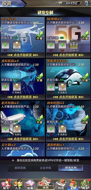 点击“研发专利”选项即可进入对应的界面,这里设有多个研发工位。点击工位旁的加号,就能安排一名人才进入学习;待学习结束后,该人才的技能会得到提升。大家可以注意到,每个研发项目都有对应的等级,提升等级的方法正如前面所提到的——需使用企业并购获得的奖励道具。项目等级越高,人才在学习过程中获取的经验值就越丰厚。另外需要提醒的是,每天每人有3次参与学习的机会。