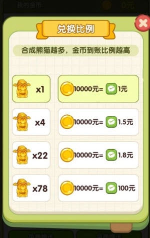 在开心叠一叠这款游戏里,设计了不少获取收益的途径,像合成熊猫、金币兑换现金、红包提取现金等,不过实际能成功赚到钱的机会却不多。就拿金币兑换现金来说,一万枚金币才只能兑换一元钱,并且还得先合成一只熊猫才行。