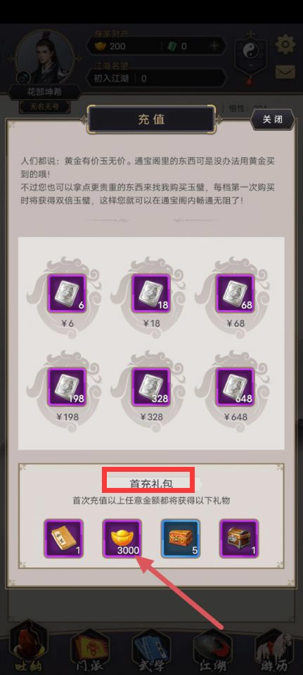1.充值玉璧可以获得首充礼包有黄金3000