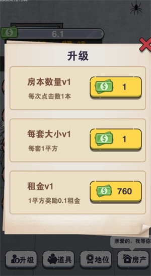 2、点击升级提升个人能力,提高收租获得的财富