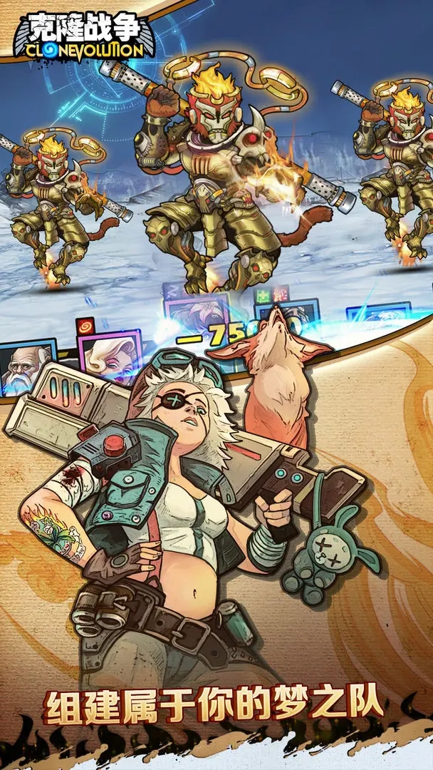 克隆战争是一款末世废土风格的卡牌回合制游戏。在科技高度发达的背景下,形形色色的克隆人相继出现,而这种克隆行为被视为违背道德准则,所以玩家的任务便是对这些克隆体发起讨伐。游戏过程中,玩家需要精心搭配自己的小队阵容,以此来与庞大的克隆军团展开对抗。