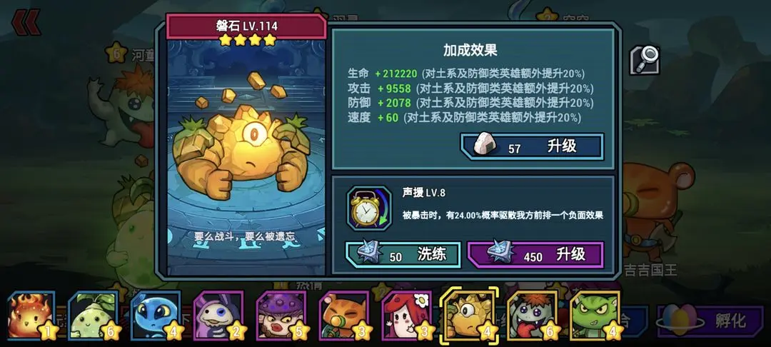 如图所示,右上方标注着“对土系及防御英雄额外提升...”,这表明该技能仅对土系英雄或防御性英雄生效。具体来说:像象神这类土系攻击型英雄,因满足“土系”这一条件,技能可生效并获得+1效果;灯神属于光系防御型英雄,符合“防御”要求,技能同样生效+1;而奥力作为土系防御型英雄,同时满足两个条件,技能自然也能生效+1。简言之,只要满足“土系”或“防御”其中一个条件即可触发技能效果。
