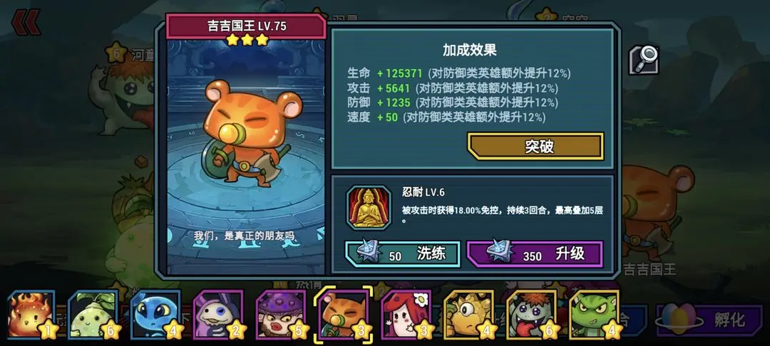 吉吉国王建议,防御类英雄适合洗练忍耐(以增强免控能力)、生命以及爆抗这几种属性。