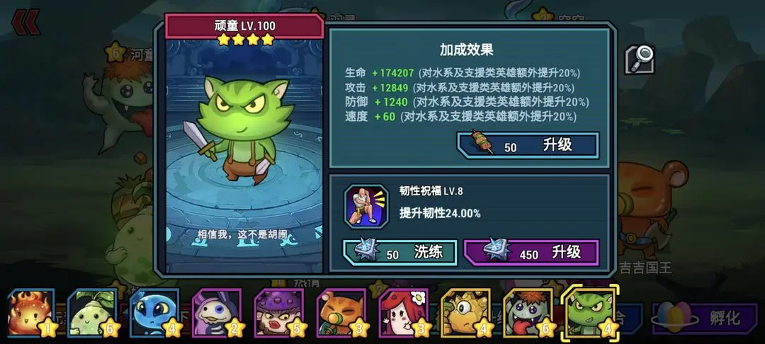 河童:技能对火系英雄与进攻型英雄生效,建议洗撕裂(回合盾数量越多伤害越高,若能确保输出头上有三个及以上回合盾则必选,有福尔摩斯的玩家也必选)、攻击、速度。