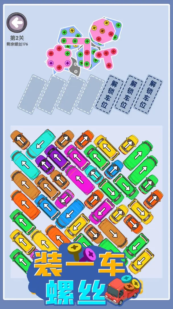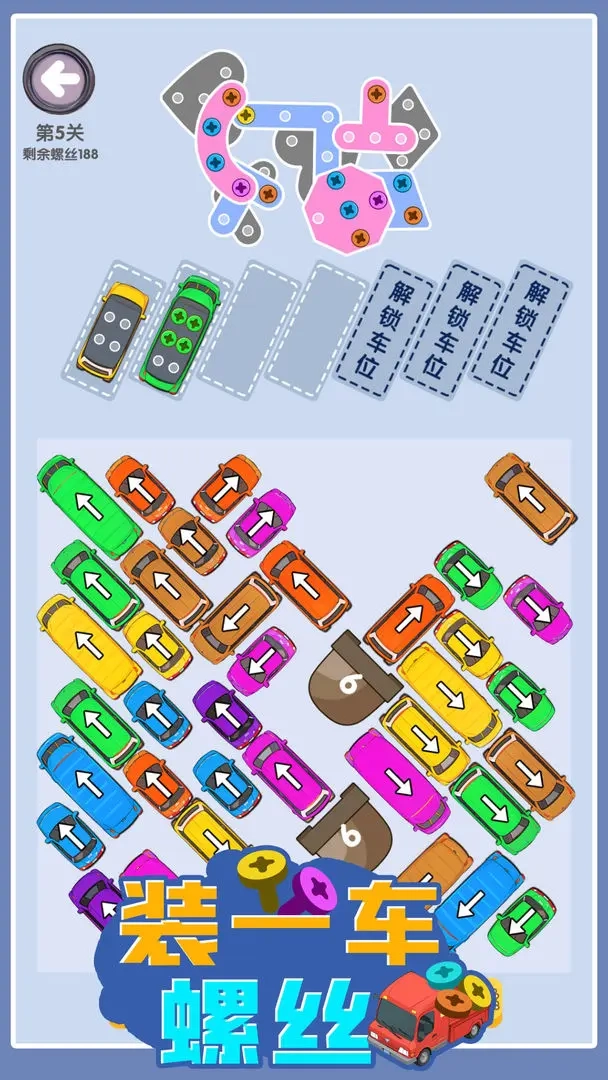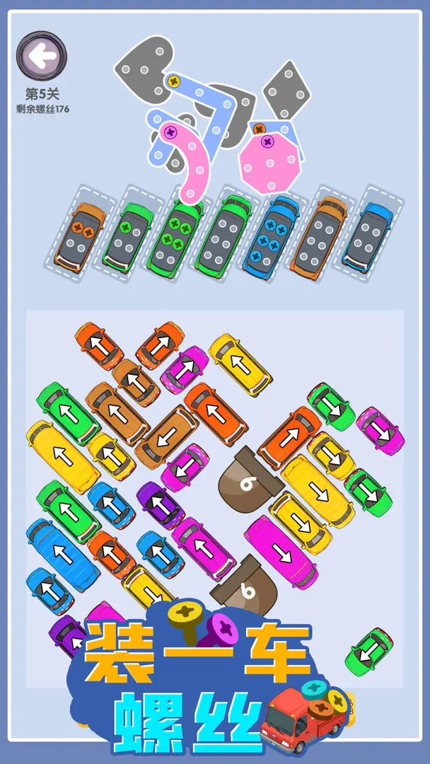 《装一车螺丝》是一款颇具创意的益智游戏,玩家在游戏里要指挥车辆,把木板上的螺丝装进汽车内。游戏的核心玩法简洁且具有教育价值:玩家需将木板上颜色各异的螺丝,对应装入不同颜色的汽车中,完成这些任务后,汽车才能顺利开走。