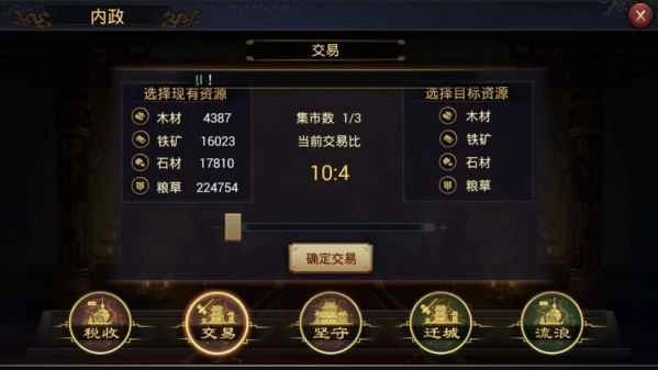 5、资源兑换功能新手刚进入率土之滨时是没有的,需要解锁集市后才会出现,具体是通过其他资源来兑换铁矿。