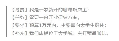 比如上面提到的咖啡店开业方案,刚做出来的第一版肯定没办法满足我们的需求,得通过不断提问的方式来让方案内容得到优化,直到它能符合我们的要求为止。