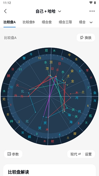4、此时便可开展合盘操作,完成合盘后,就能查看自己与对方的星座参数解读等相关内容。