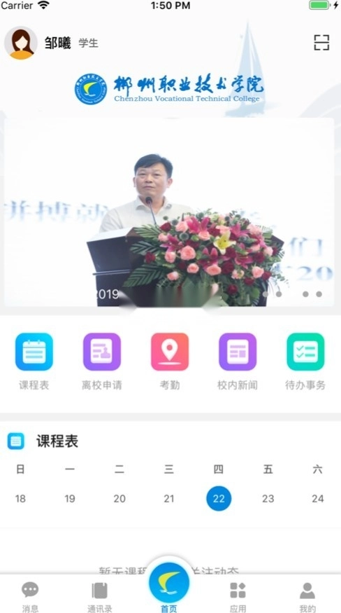 “智慧郴职”已搭建起学校内部移动信息门户的展示与操作平台,该平台可支持全校师生通过移动端办理校园管理、学生生活、学业课程等各类业务,从而为师生的教学、学习及生活提供便利。