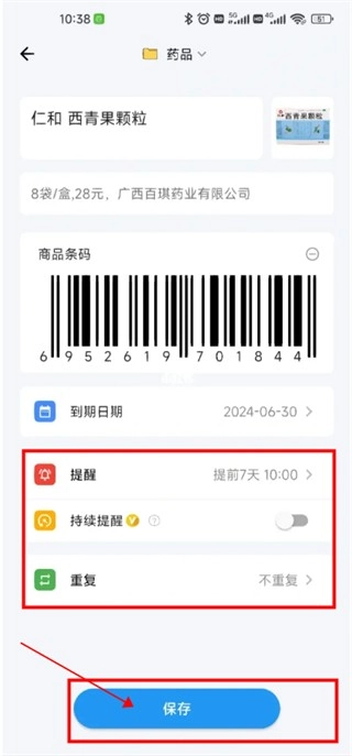 3、设置好提醒时间,点击保存,即可录入成功