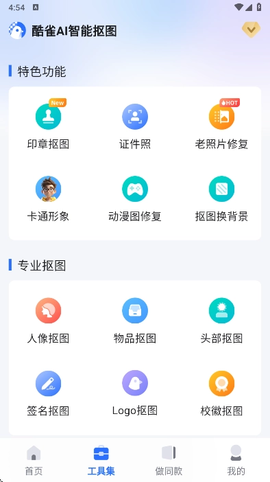 酷雀AI智能抠图是一款专业的抠图应用,借助它能为用户带来良好的图片编辑体验。用户可以快速完成批量抠图等一系列功能操作,轻松处理各类图像,让操作更加便捷,有需要的朋友不妨现在就来使用!