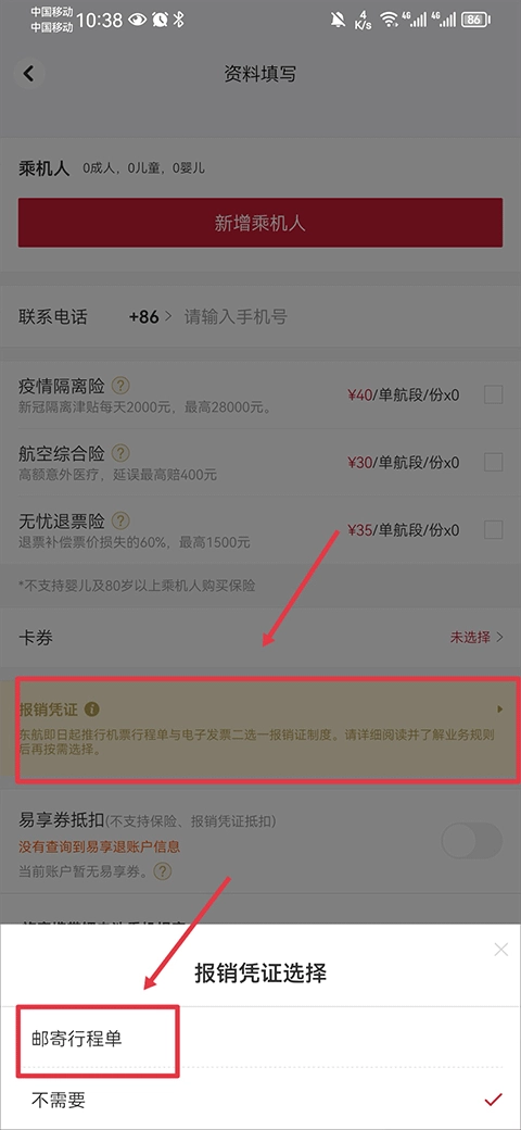 4、接着在资料填写页面点击报销凭证,选择邮寄行程单。