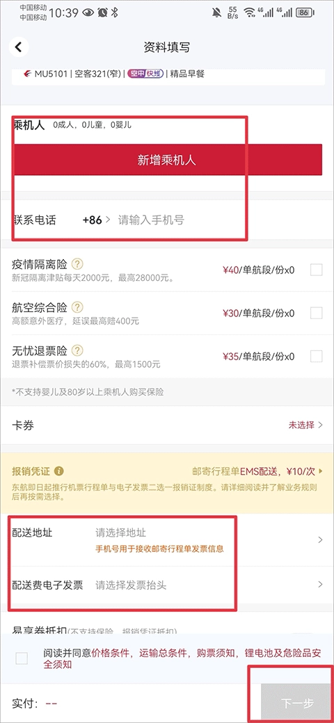 5、接着完善发票的邮寄地址、发票抬头以及乘机人信息,完成后点击下一步。