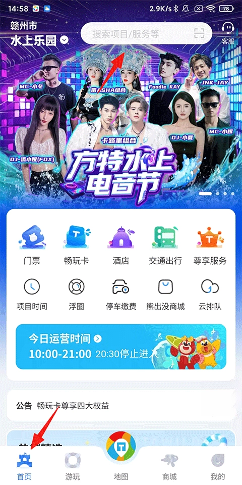 1、打开方特旅游,点击首页-屏幕上方搜索栏;