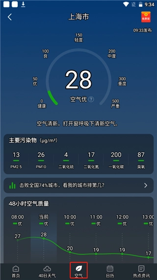 3、点击空气,它会为用户提供非常谨遵的天气质量;