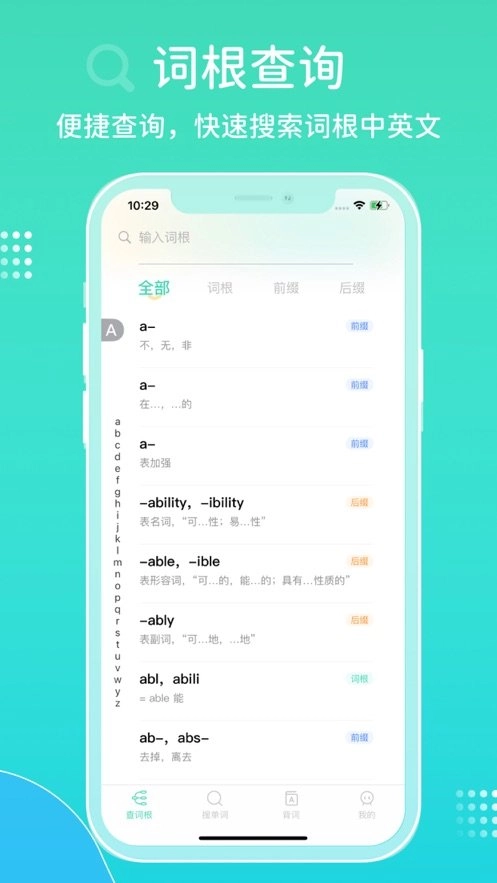 学、测一体的背词模式。支持背单词、背词根、背词缀等方式分类背词,词根优先背。开启背词提醒,养成良好背词习惯。