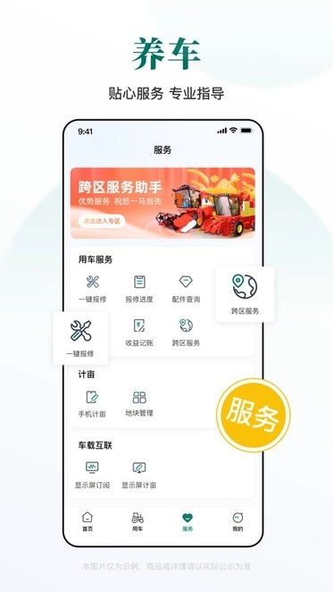 这是一款服务于农业机械应用群体的软件,主要功能涵盖雷沃农机具的购买、维修、保养以及跨区作业支持;同时还提供统计作业收益与记账数据、专属维修服务、积分商城礼品兑换等增值项目,助力用户实现车辆设备的智能管理。