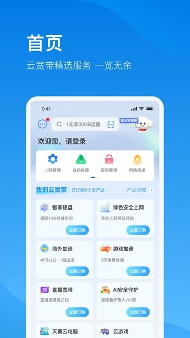 这是一款能让你享受便捷商务宽带服务的软件,你可以为自己的云宽带设置专属密码,每次登录时输入密码就能轻松上网。它能帮助大家快速进入各个产品的界面详情页,订购时长也可以自由选择,使用起来十分便捷。