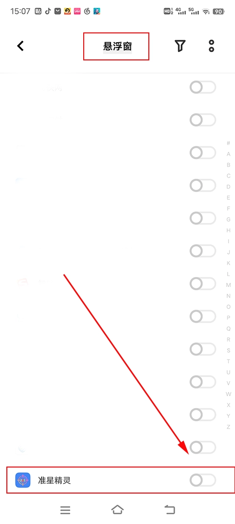 1、首次打开软件时,系统会自动弹出“悬浮窗”权限申请页面,此时我们需要找到“准星精灵”并勾选以允许该权限