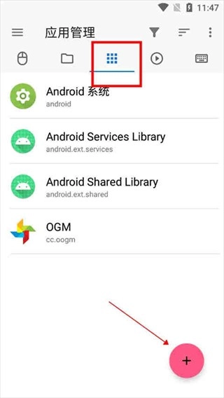 4、上方选项栏点至应用,右下角+号安装应用,选择手机中提前好的apk。