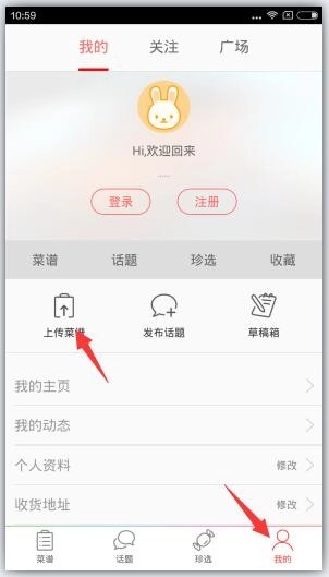 1、打开美食天下点击“我”选择“上传菜谱”