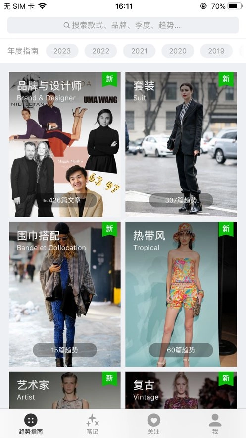 这是一份便捷的年度趋势指南,栏目中设有多个年份切换的选择标签,不同标签下分别汇总了对应的时尚元素。