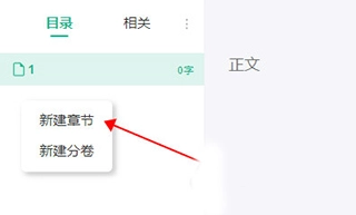3、在目录区域上点击鼠标右键,从弹出的选项中选择新建章节,如此之后便能够在正文区进行创作。