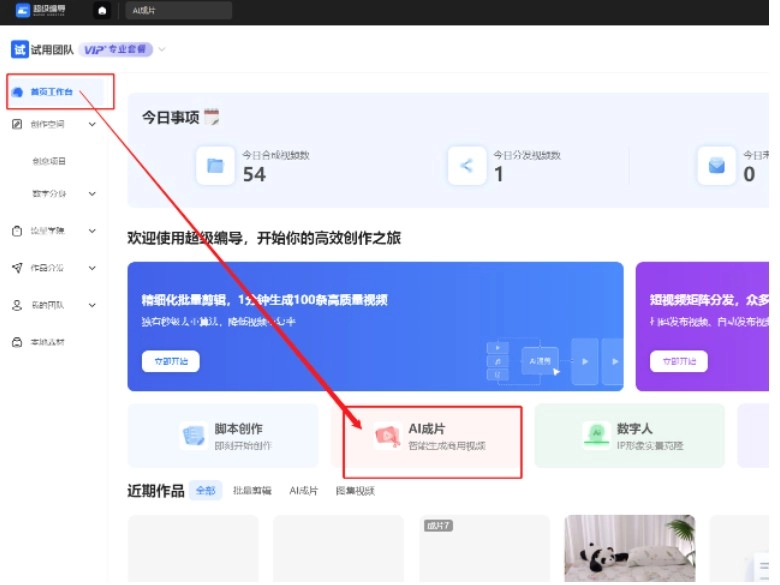 进入首页后,系统会呈现【AI成片】、【定制数字人】、【矩阵发布】等功能入口。