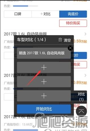 就会弹出一个车型对比窗口,若只有一款车型版本,需添加对比的车型版本,点击“+号”按钮。