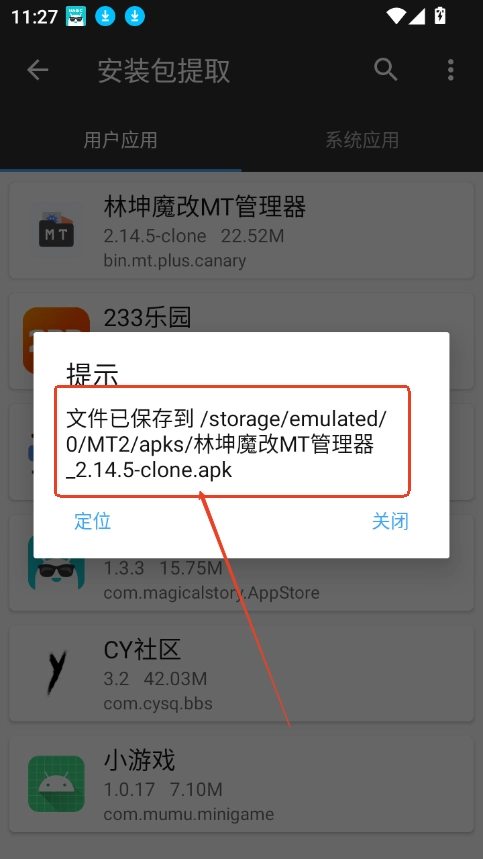 你可以从设备已有的各类程序里挑选,既包括自己安装的本地程序,也能选系统初始配备的程序。比如选一款叫MT管理器的程序,找到并点击“提取安装包”这个功能选项。