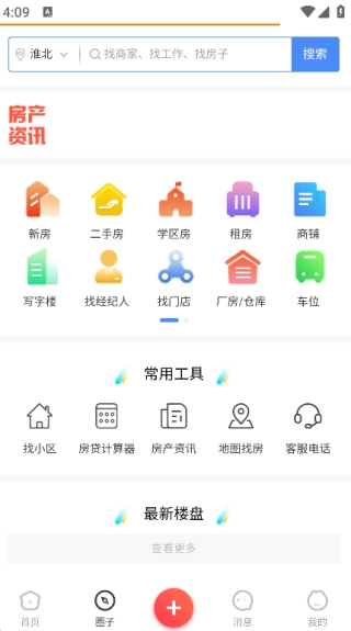 点击页面下方的“圈子”按钮,就能使用找小区、房贷计算器、房产资讯等各类功能。