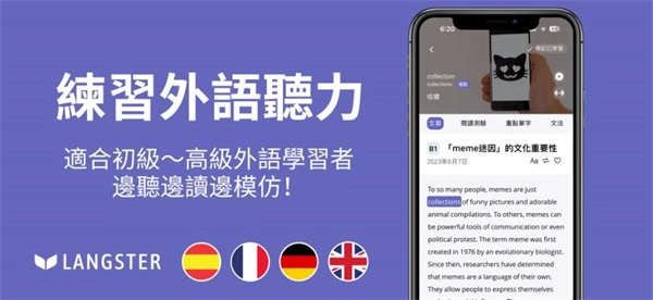 Langster目前为使用者提供英语、法语、德语、西班牙语、日语和中文的学习服务,未来还会增加更多可学习的语言。