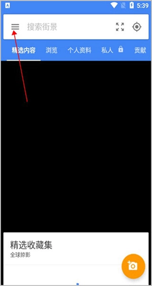 在本站完成谷歌街景的安装操作,打开该应用后,在界面上方的搜索区域输入“街景”进行搜索,随后点击左上角的按钮进入菜单界面。