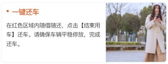 在指定的红色区域内可以随时借车和还车,还车时请点击【结束用车】按钮。请务必将车辆平稳停放好,以完成还车流程。