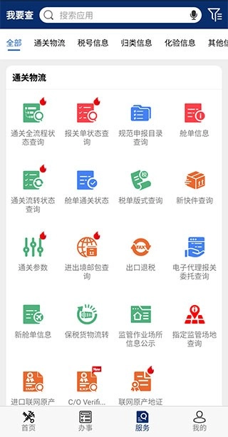 在【办事】板块,用户能够找到涵盖运输工具、货物及物品通关等多类别的事项办理服务,满足不同场景下的业务需求。