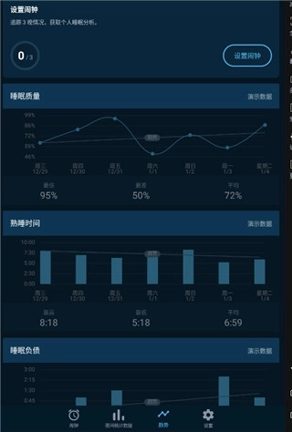 3、点击“趋势”选项,用户可以清晰直观地查看自己的睡眠质量、熟睡时长、睡眠负载等各项睡眠相关数据。