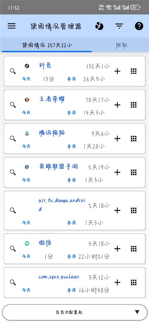 点击应用右侧的加号能够限制软件的使用时长,旁边的表格图标则可用于执行更多操作。