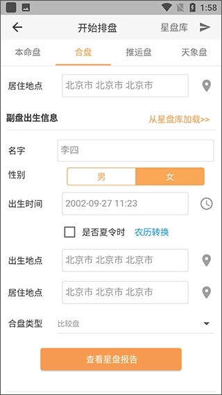 2、主盘填写你的姓名、性别、出生时间与地点,副盘填写你朋友的相关信息,选择比较盘类型后,点击查看星盘报告即可。